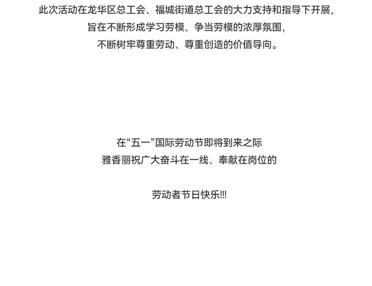 發(fā)揮新時(shí)代勞動(dòng)"工匠"的示范帶頭作用,大力弘揚(yáng)勞模精神;新和社區(qū)工聯(lián)會(huì)在雅香麗化妝用品(深圳)有限公司開展 “爭(zhēng)做奮斗者,禮贊勞動(dòng)者”五一勞動(dòng)節(jié)活動(dòng)。